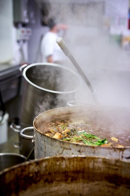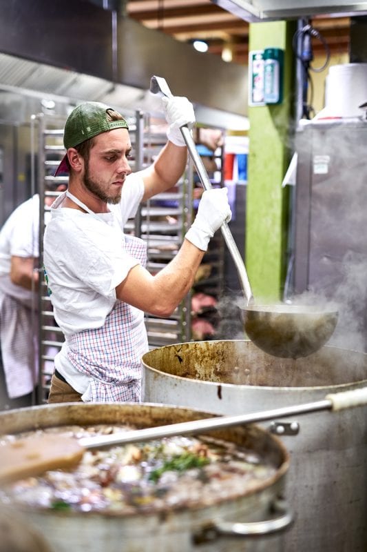 Die Arbeit, die hier in der größten Küche auf der Wiesn geleistet wird, ist beeindruckend – und das Ergebnis wahnsinnig gut. „Packl“ gibts hier nicht. Und auch keine kleinen Schöpflöffel.