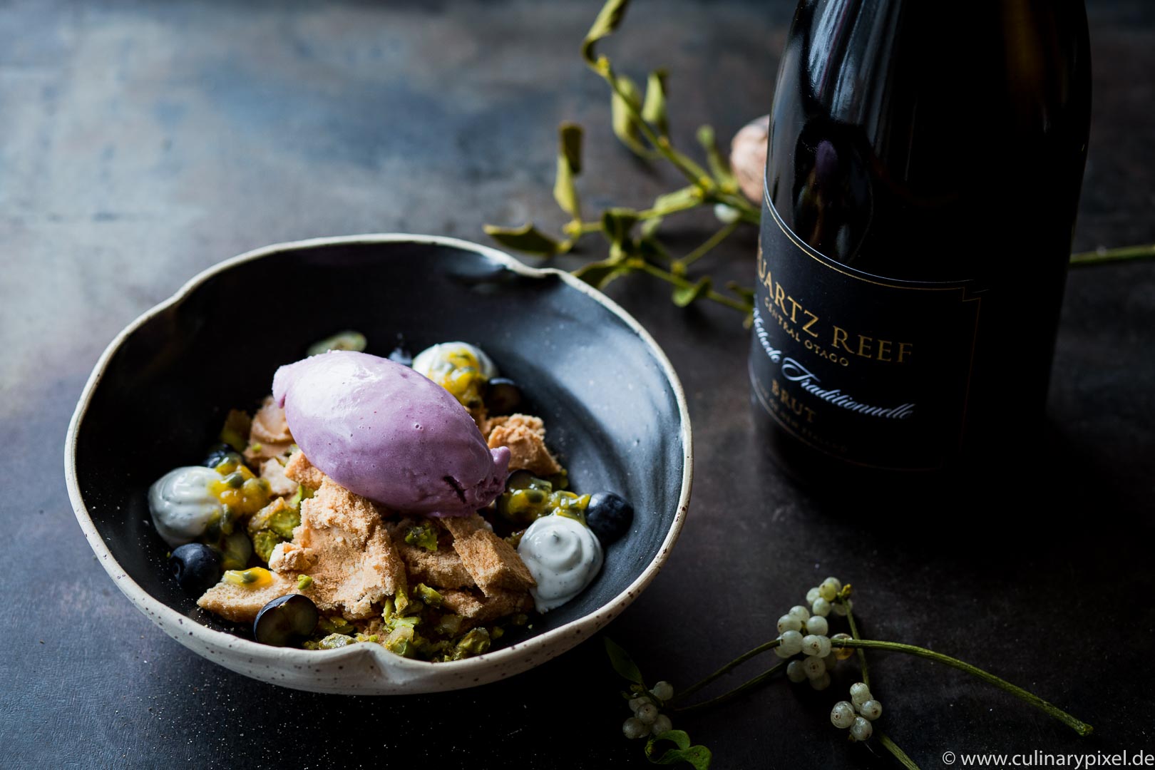 Nach den zwei Hirsch-Gängen – die ja beide eher in die leichte, frische Richtung gehen – war es mir wichtig, auch das Dessert nicht zu schwer zu gestalten. Jetzt, wo es bei uns kalt ist und Mandarinen und Nüsse Hochsaison haben, ist in Neuseeland Hochsommer. Blaubeeren, Maracuja und frischer Joghurt passen also wunderbar ins Konzept – auch zu dem feinen Schaumwein!