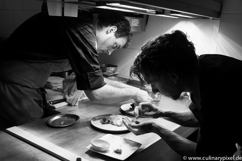 Beim Anrichten der ersten Vorspeisen offenbart die kühlende Theke unter der metallenen Arbeitsplatte eine Schatzkammer an Blüten, Kräutern und Kressen. So sehr sie zwar optisch eine gute Figur machen, sie werden nicht als Schnick-Schnack für’s Auge so akribisch auf den Tellern arrangiert. Jedes Kraut hat seine Rolle als Baustein in den komplexen und ausgetüftelten Gerichten auf der Karte. Die schmückt sich mit drei verschiedenen Menüs: Soli, Gaudi und Omni.