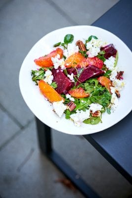 Zu den gegrillten Hähnchenschenkeln vom Big Green Egg passt zum Beispiel ein Rote-Beete-Orangen-Salat und frisches Brot.