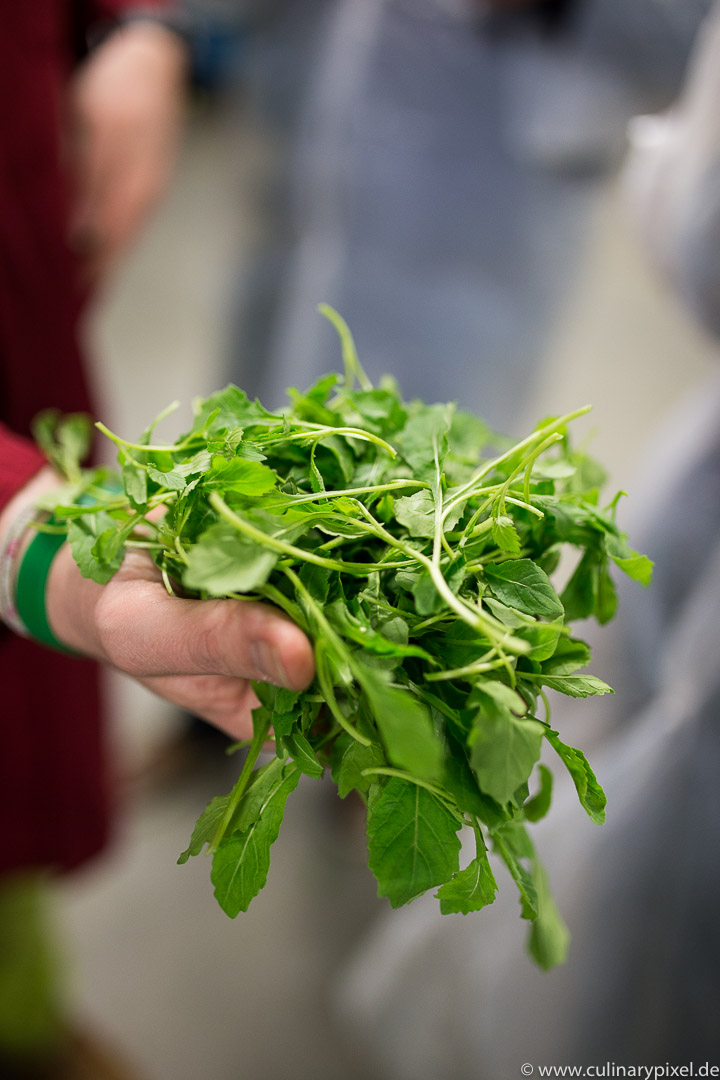 Lachsforelle (Gutshof Polting) | Frankfurter grünes Curry (Reingold) | Wildkräuter Mix (Keltenhof) | Prisecco Eisapfel (Jörg Geiger)