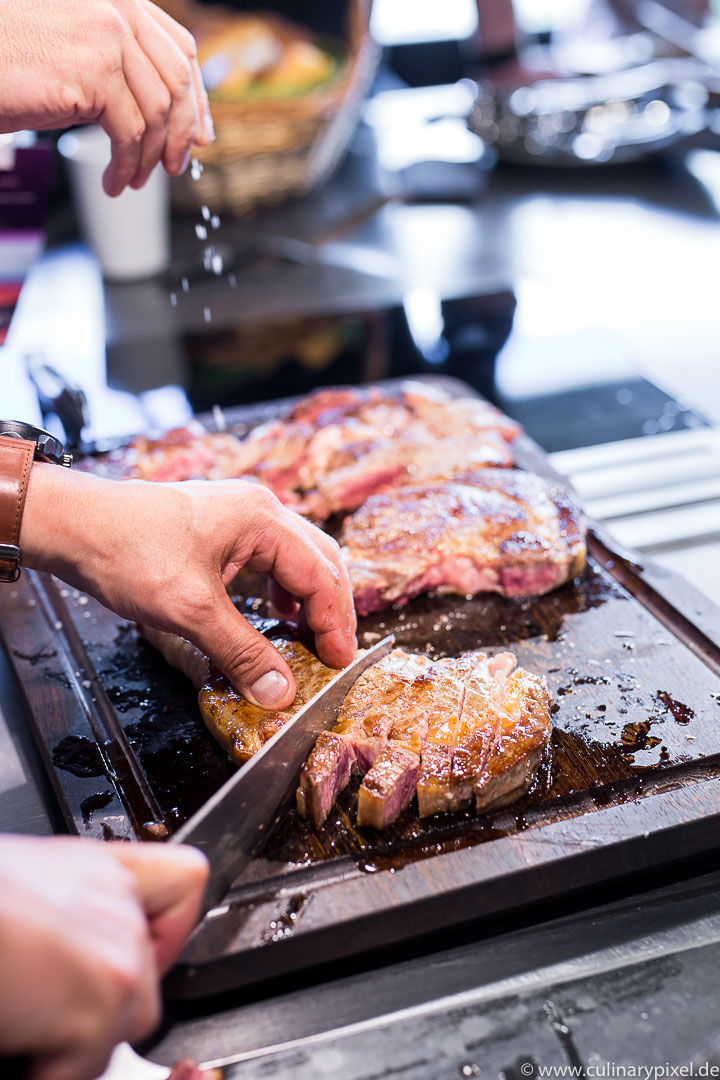 Marco Tessaro (Luma Delikatessen) ist einer der Gründer von Luma Delikatessen, bekannt für die Fleischveredelung mit Edelschimmelpilz. Die Verkostung des gegrillten Rind und Schweinefleischs hat durch die Bank begeistert – insbesondere Qualität und Geschmack des Schweinefleischs ist einzigartig, auch in Kombination mit Jean Lucs Saucen.