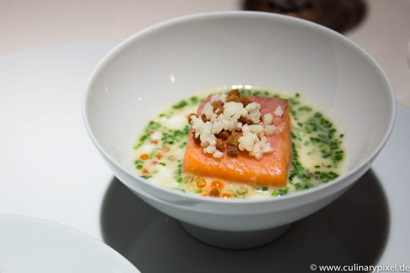 Das klassisch abgeschmeckte Tatar lässt die hervorragende Fleischqualität wunderbar zur Geltung kommen (das Walser Höhenvieh scheint eine Erforschung in Form größerer Fleisch-Mengen absolut wert), der feine Sauerrahm und die kräftig-erdige Urkarotte lösen die pure Würzigkeit schön auf. Der Imperial Kaviar fügt sich ins Geschmacksbild, als hätte er schon immer zum Rind gehört und schlägt mit seiner Textur noch dazu die Brücke zum zweiten Amuse. Die schmeichelnde Cremigkeit vom Blumenkohl, in der die glasig confierte Lachsforelle gebettet ist, wird vom fein knackenden Rogen und der perlenden Frische des Champagners wunderbar aufgehoben – mehr bräuchte es eigentlich schon gar nicht. Schon am Anfang vielleicht mein Highlight des Menüs.