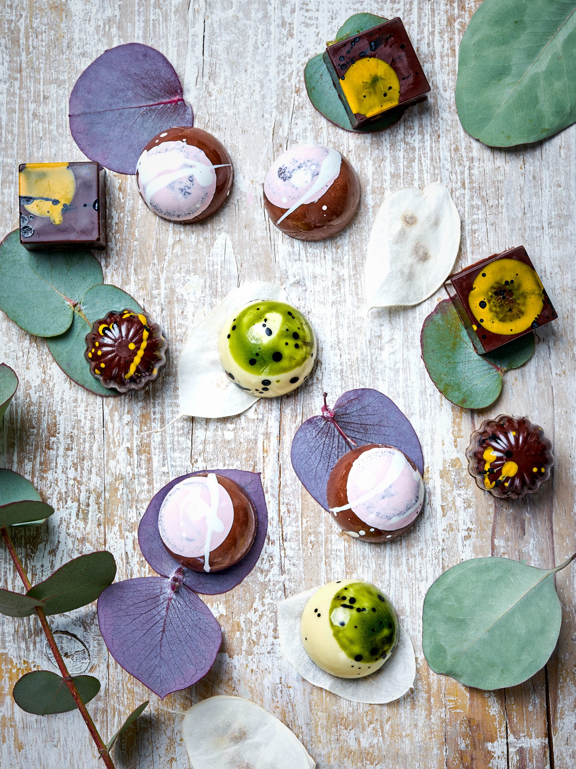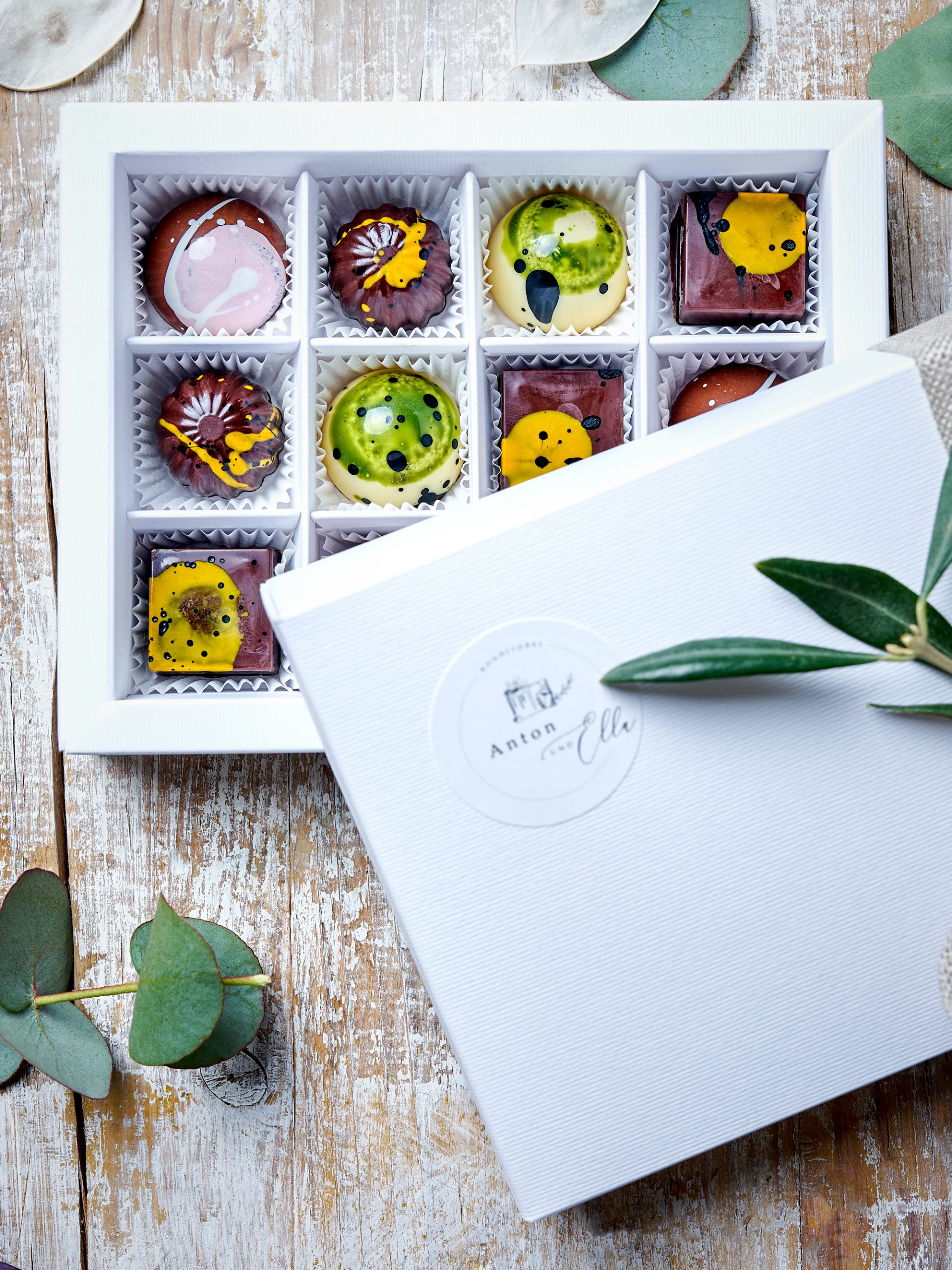 Die Osterkollektion von der Konditorei Anton & Ella in München bestand aus verschiedenen Pralinen-Sorten und Geschenkverpackungen. Meisterkonditorin Julia Mauracher macht alles per Hand und aus besten Grundprodukten. Die bunten Sorten auf den Bildern umfassten „Fleur De Sel & Kardamom“, „Dunkle Cassis“, „Milch, Walnuss & Salted Caramel“ und „Weiße Kokos-Mandel“.