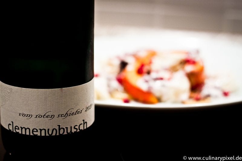 Den fertig gegarten Kürbis mit einer Kugel zerrupftem Mozzarella (ich gebe zu – diesmal hatte ich leider! „nur“ normalen Mozzarella – lieber wäre mir der vom Büffel gewesen) und dem Dressing anrichten. Dazu – wie gesagt zum Beispiel ein Glas Riesling. Der Clemens Busch ist ganz oben auf meine Einkaufsliste gewandert.
