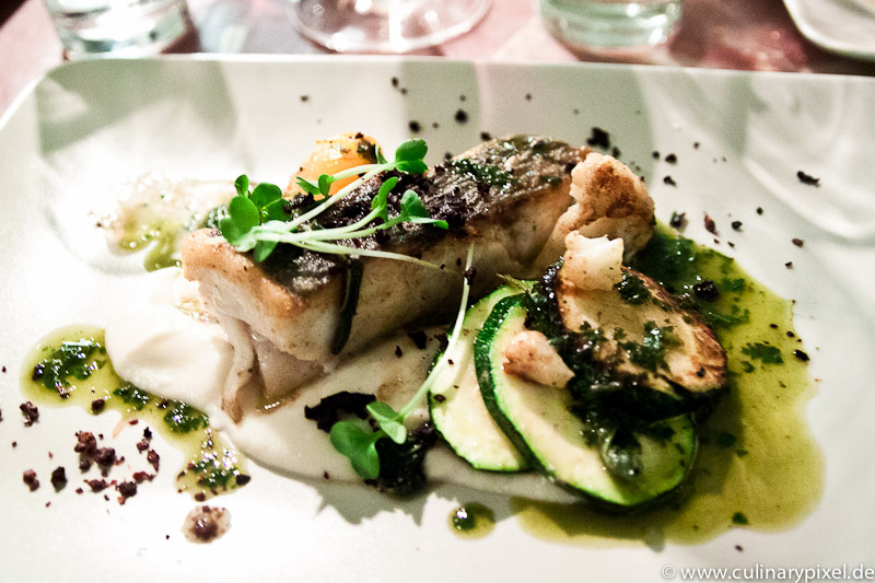 Bedenkt man, dass wir drei ein eher komplizierter Gäste-Haufen waren, muss man sowohl Küche als auch Service eigentlich für ihre Freundlichkeit, Flexibiliät und alles drum rum noch einen extra Preis verleihen. Meine Freundin (wir waren teils vegan unterwegs, schon im Tian wer sich erinnert) hatte schon vorher per Email angefragt ob eine vegane Variante des Menüs wohl möglich wäre. Eine Speisekarte gibt es im Kontrapunkt nämlich nicht – das Menü wechselt jeden Tag, ist eine Überraschung und selbstredend marktfrisch. Mit Fokus mehr auf Fisch, als auf Fleisch. Vegan war also möglich, kriegen wir schon. Fein, nichts wie hin.