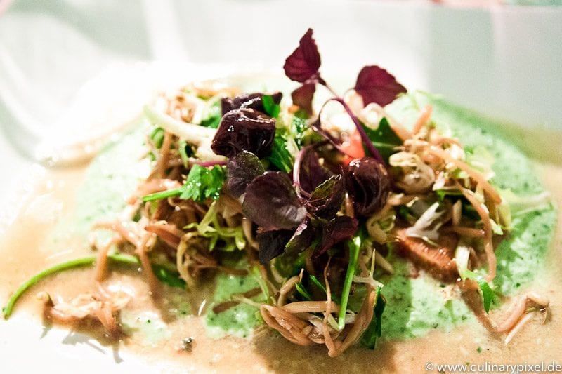 Auch die vegane Variante sei sehr positiv erwähnt. Es gab nicht nur „Beilagen-Küche“ sondern im Teig gebackenes Thaibasilikum, Seidentofu und allerlei andere (wirklich leckere!) Gänge. Wann kommt es schon mal vor, dass jemand seinen veganen Teller vor den Tischnachbarn verteidigen muss?