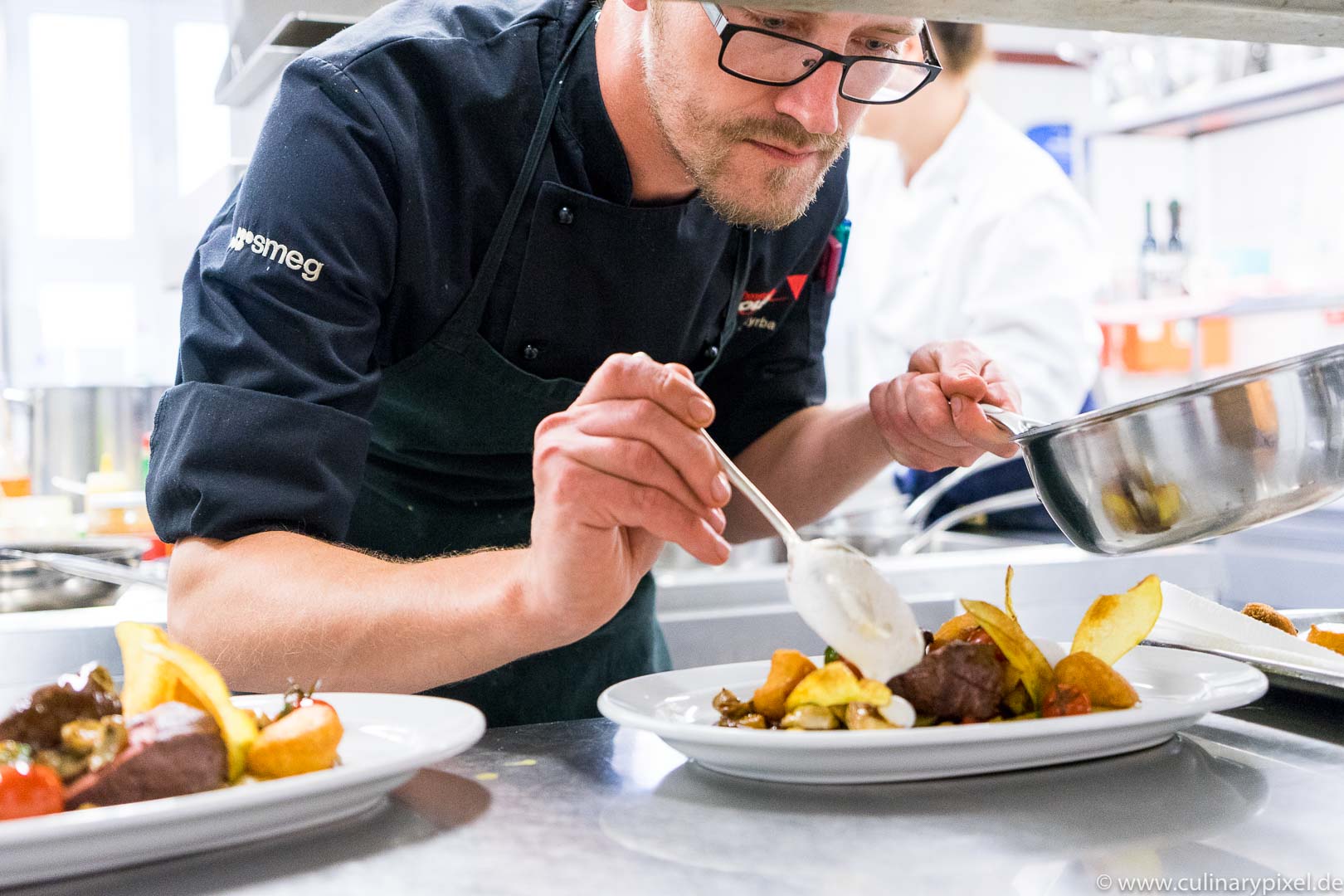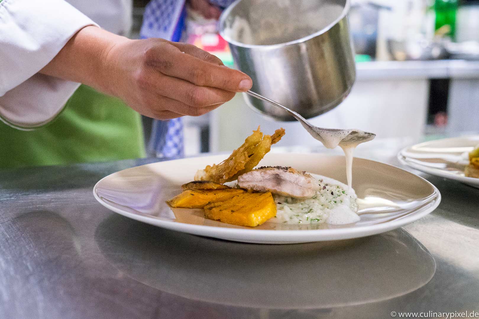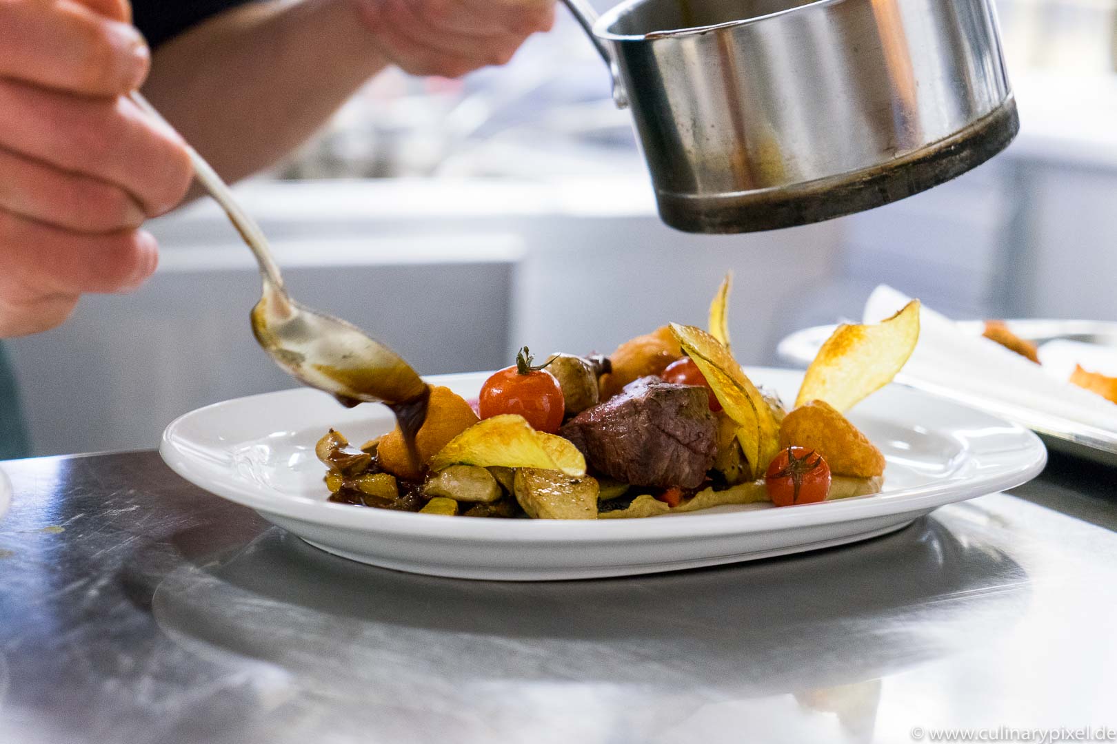 Ich verbringe meinen Mittag im historisch eingerichteten Restaurant und habe zwischen den Gängen auch die Möglichkeit, mich in der Küche ein bisschen umzusehen. Auf den Teller kommen bayerische und fränkische Spezialitäten ebenso wie französische und deutsche Klassiker, handwerklich einwandfrei und mit Liebe zu Detail und Zutaten zubereitet.