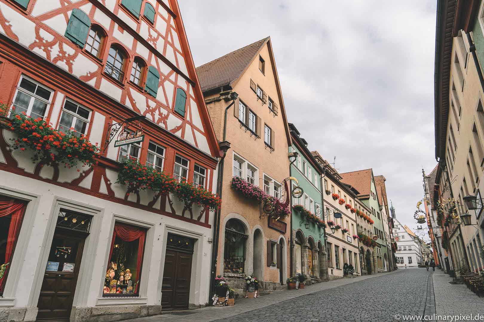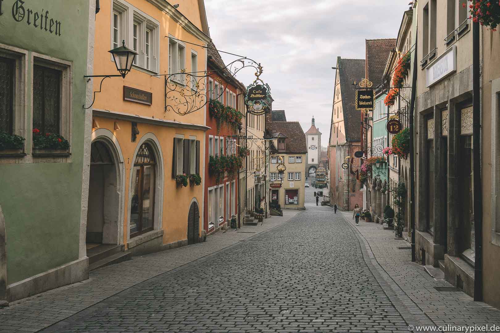 Die schlechte Nachricht: früh aufstehen. Oder spät aufbleiben. Die gute: Rothenburg geht auch „without people“ und ist dann umso schöner. Die Gässchen sind früh morgens genauso leer wie abends nach 8 oder 9 Uhr, da wird das Städtchen schläfrig und im Laternenschein noch romantischer, als ohnehin schon. Es lohnt sich – wie an so vielen anderen fotogenen Orten – ein bisschen gegen den Strom zu schwimmen.