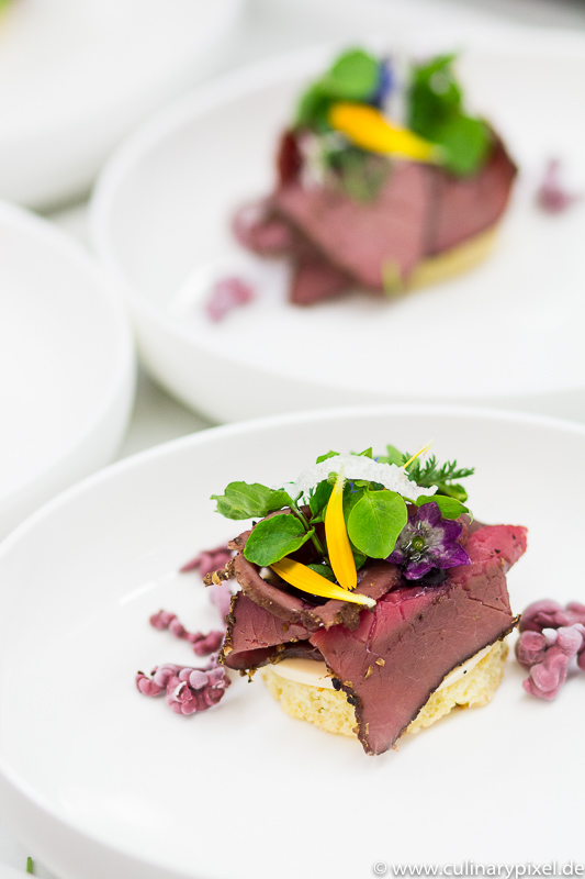 Tohrua Nakamura schickte zusätzlich zu seinem eigentlichen Teller noch ein Amuse mit dem Produkt eines der Hauptsponsoren des Events vorweg. Das Hirschpastrami vom Neuseelandhirsch bekam Begleitung von Holunder, Haselnuss und Hanfsamen. Tohru und sein Team interpretierten das „Stadt, Land, Fluss“ Thema also auf die wortwörtliche spielerische Weise. Sie entwickelten die Gerichte auf dem Papier, schrieben Listen mit den möglichen Zutaten der verschiedenen Anfangsbuchstaben zusammen und setzten dann zusammen, was zusammen passte – spannend, was dabei heraus kam!