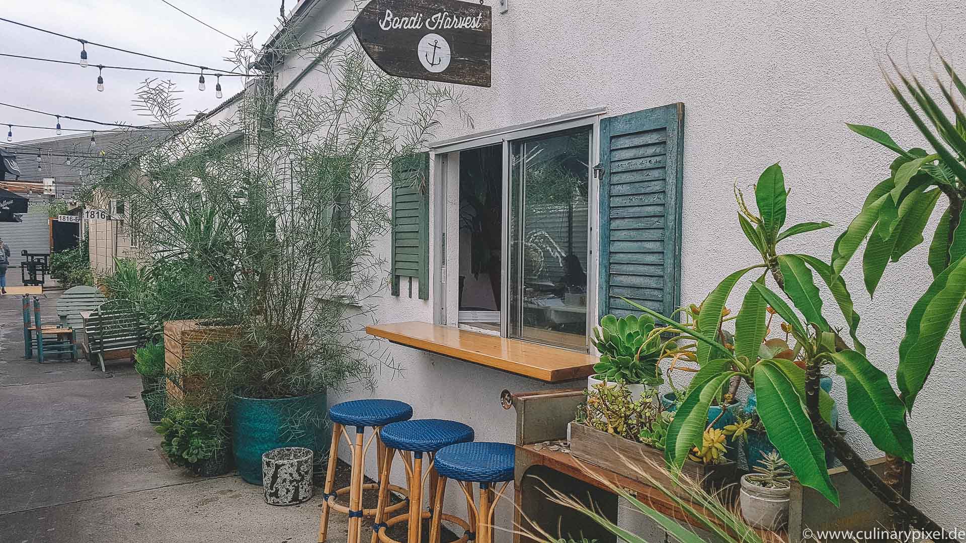 Auch wenn auch Kalifornien selbst einen Beach-Surf-Lifestyle genießt, so haben es sich ein paar Australier trotzdem nicht nehmen lassen, den relaxten Flair ihrer Heimat hierher zu bringen. Und das kommt ziemlich gut an. Bondi Harvest war ursprünglich mal ein YouTube Kanal, mittlerweile gibt es ein Kochbuch, eine TV Serie und eben dieses trendige Café dazu. Und ich muss sagen: ich war absolut begeistert. Mitten im Industriegebiet gelegen und doch spürt man die lockere Atmosphäre dank perfekt unperfekt ausgewählter Einrichtung, Deko und Accessoires.